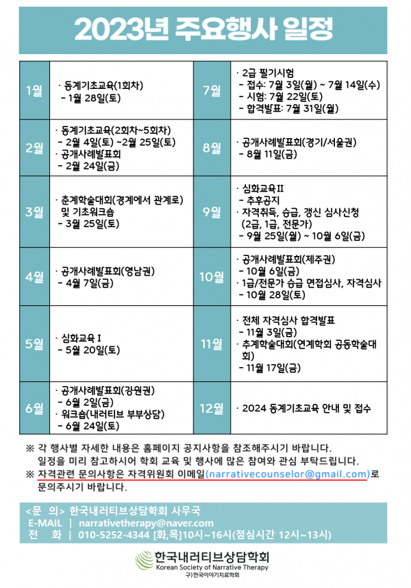 사업자등록번호 : 217-82-73320 | 사무국 E-mail : narrativetherapy@naver.com | 자격위 E-mail : narrativecounselor@gmail.com